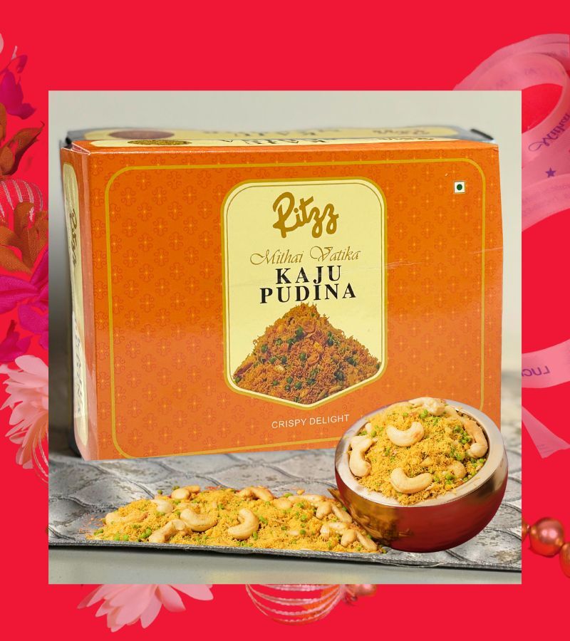 RITZZ Kaju Pudina Namkeen is a savory snack that combines the richness of cashew nuts with the refreshing flavor of mint (pudina). It's a type of namkeen, which is a broad category of Indian snacks. The snack is likely roasted and/or fried, and seasoned with spices to enhance the flavor of the cashews and mint.
